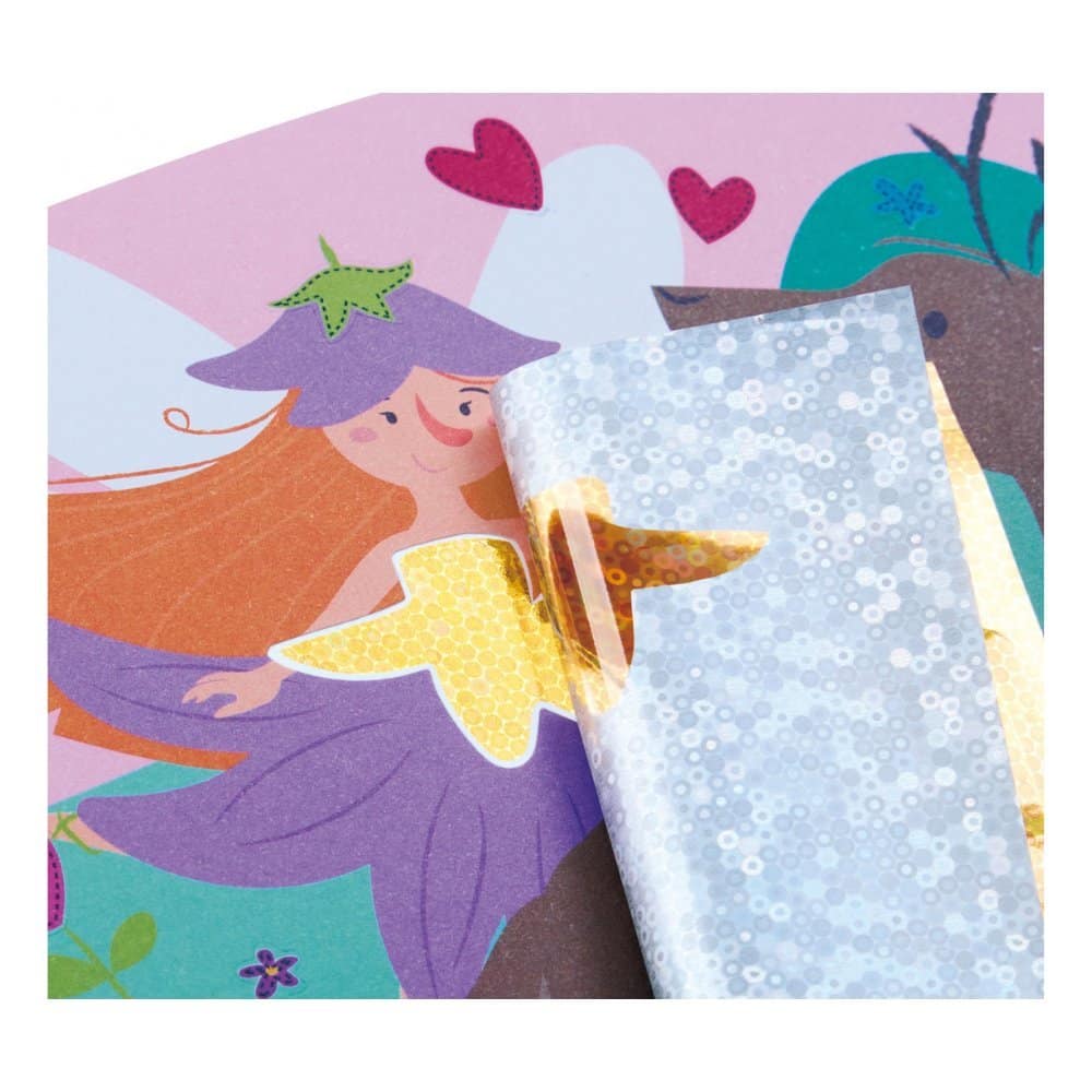 Fëmijët mund të krijojnë histori magjike me zanat duke përdorur fletët me foil dhe ilustrimet e përgatitura. Thjesht vendosin sticker dhe aplikojnë foil mbi to për të krijuar efekte të bukura dhe tërheqëse.