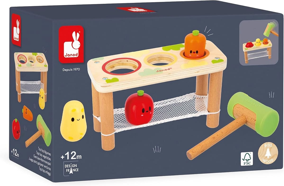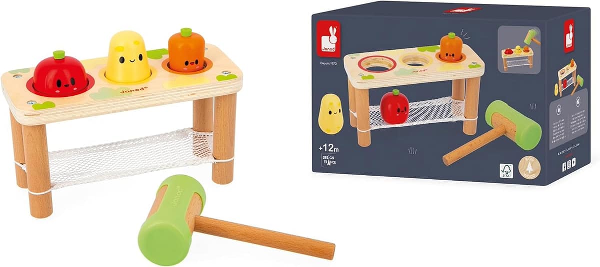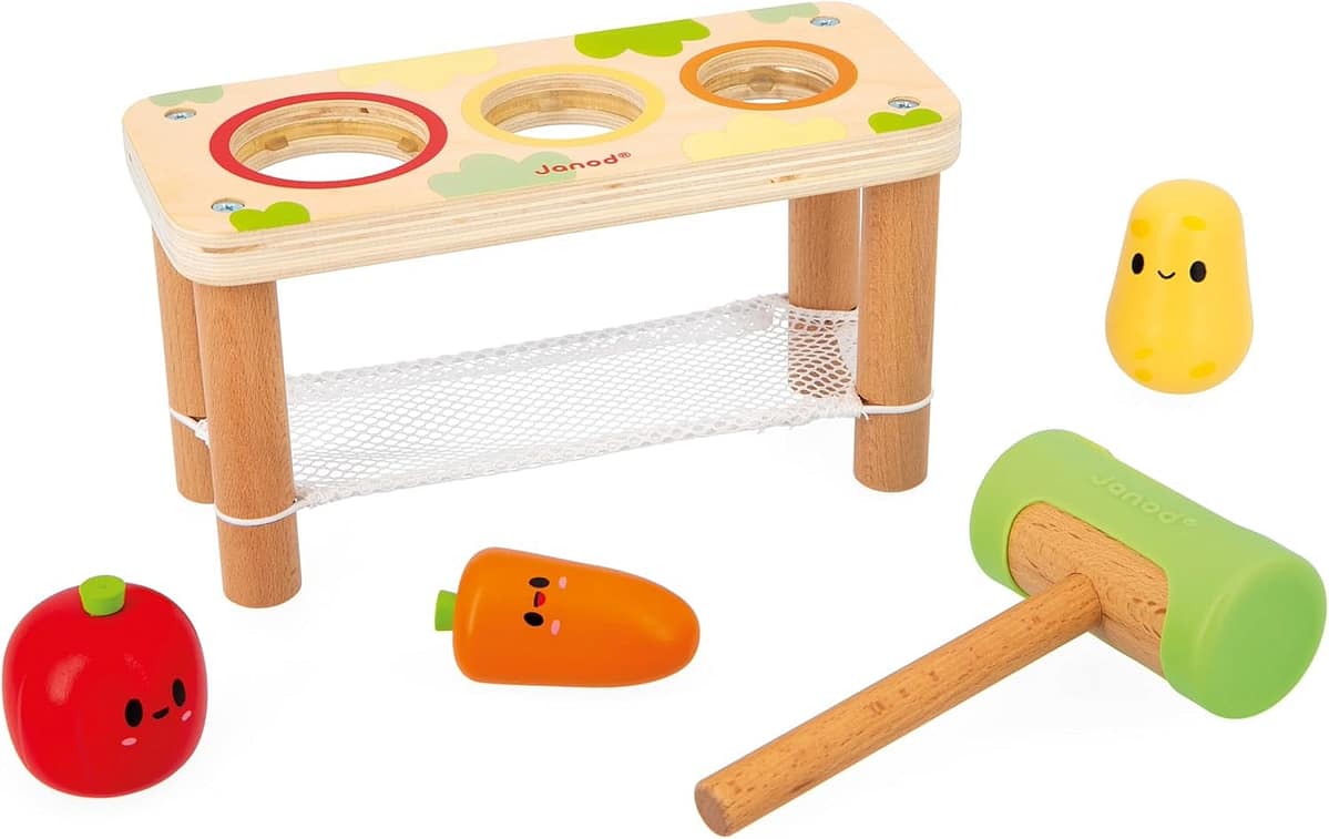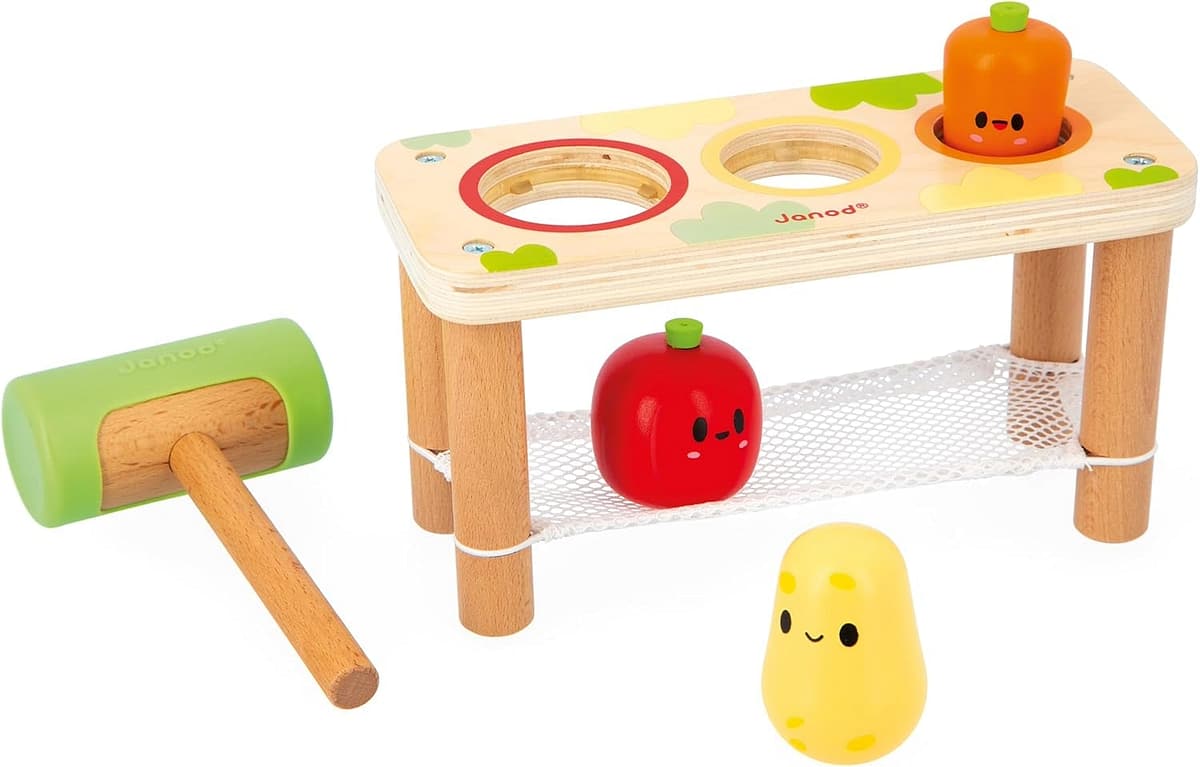Fëmija forcon shpejtësinë dhe koordinimin sy–dorë, duke goditur me çekiçin druri perimet e vendosura në tavolinë. Secili goditje është një hap i vogël drejt aftësive më komplekse motorike.