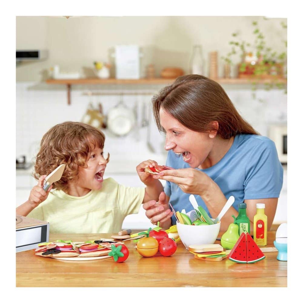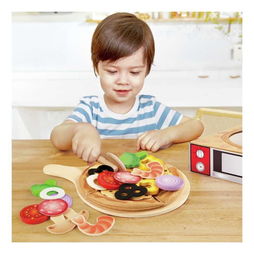 Seti përfshin bazën e picës që mund të ndahet në feta, një prerëse dhe shumë elementë shtesë që e bëjnë lojën më realiste dhe tërheqëse. Përmes kësaj loje, fëmija zhvillon kreativitetin dhe ndërton histori të ndryshme si një kuzhinier i vogël.