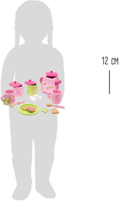 Seti plotësohet me dy lugë, dy qese çaji, dy kuba sheqeri, një pjatë dhe dy biskota të shijshme prej druri, duke ofruar gjithçka që nevojitet për një lojë çaji imagjinare. Elementët prej druri janë të përshtatshëm për dy persona dhe ftojnë fëmijët të luajnë së bashku.